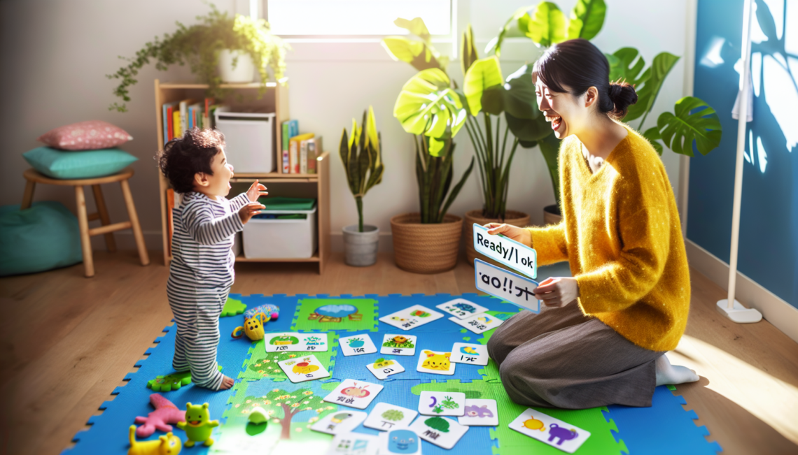 - 語彙カードの準備:「jump / ジャンプ」「crawl / はう」「turn / 回る」「stop / 止まれ」など、動作に対応したカードを用意し、親が見せながら声に出します。